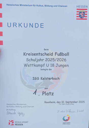 Am 10. September 2025 fand im Sportpark Raunheim das große Schulfußballturnier mit 13 teilnehmenden Schulen statt. Die IGS Kelsterbach knüpfte dabei an ihre starken Leistungen aus dem vergangenen Schuljahr an und überzeugte mit einer herausragenden Teamleistung. Koordiniert wurde die Mannschaft von den erfahrenen Spielern Osman B. (Klasse 9.2) und Ibrahim F. (Klasse 10.4), die im Sinne des SHS-Projektes das Team der Jahrgänge 2010–2012 sicher durch das Turnier führten.