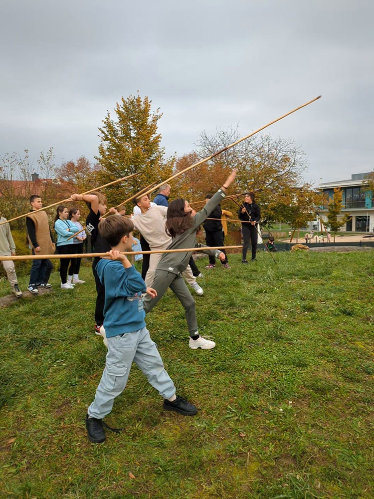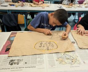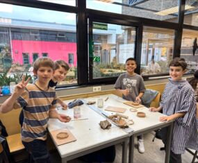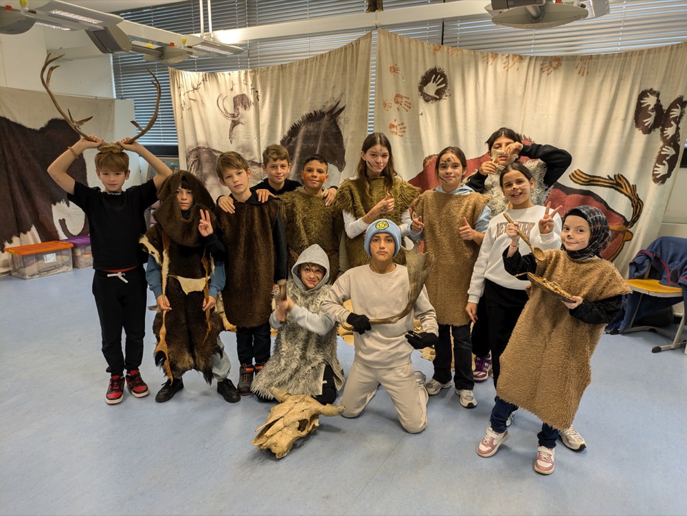 Am Montag waren wir auf einem Ausflug ins Senckenberg Museum in Frankfurt. Dort sind wir erst einmal rumgelaufen und haben uns alles angeguckt. Dann hatten wir eine Führung, ein Mann hat uns eine Steinzeit-Kiste gezeigt, wo viele alte Sachen drin waren wie z.B. eine Speerschleuder, ein altes Nähset aus Knochen und eine Schnur aus einer Sehne. Am Dienstag haben wir Höhlenmalerei ausprobiert. Wir sind in den Kunstraum gegangen und haben direkt angefangen. Erst haben wir uns ein braunes Plakat genommen und haben es zerknittert damit es so aussieht, als wenn es eine Höhlenwand wäre. Dann haben wir mit Holzkohle, zerbröselter Kreide, klein gemachter Erde, und französischem Ockergelb das Blatt angemalt. Auf unseren Bildern waren Mammuts, Bisons und Pferde. Am Mittwoch kam ein Mann zu uns, der Holger hieß. Er hat sein ganzes Steinzeit-Museum mit in unsere Schule genommen. Er hat uns sehr viel über die Steinzeit erzählt, das finde ich richtig cool. Zum Schluss sind wir dann noch rausgegangen und haben Sperre geworfen (das war mein persönliches Highlight). Am Donnerstag haben wir mit Ton gearbeitet, da hatten wir Vasen und Gefäße aus der Jungsteinzeit als Vorlage, die wir versucht haben nachzutöpfern (aber wenn ich ehrlich bin, hat eigentlich jeder irgendwas probiert). Ich habe zum Beispiel versucht eine Pfote zu machen, weil ich selbst zwei Katzen habe. Am Freitag war unser gemeinsames Abschluss-Frühstück. Als wir fertig waren, haben wir uns weiter mit der Altsteinzeit beschäftigt, da haben wir ein Video geguckt und danach haben wir unser Steinzeit Museum aufgebaut für das Schulfest am Samstag. Es war eine tolle Woche. Wir hatten alle sehr viel Spaß.