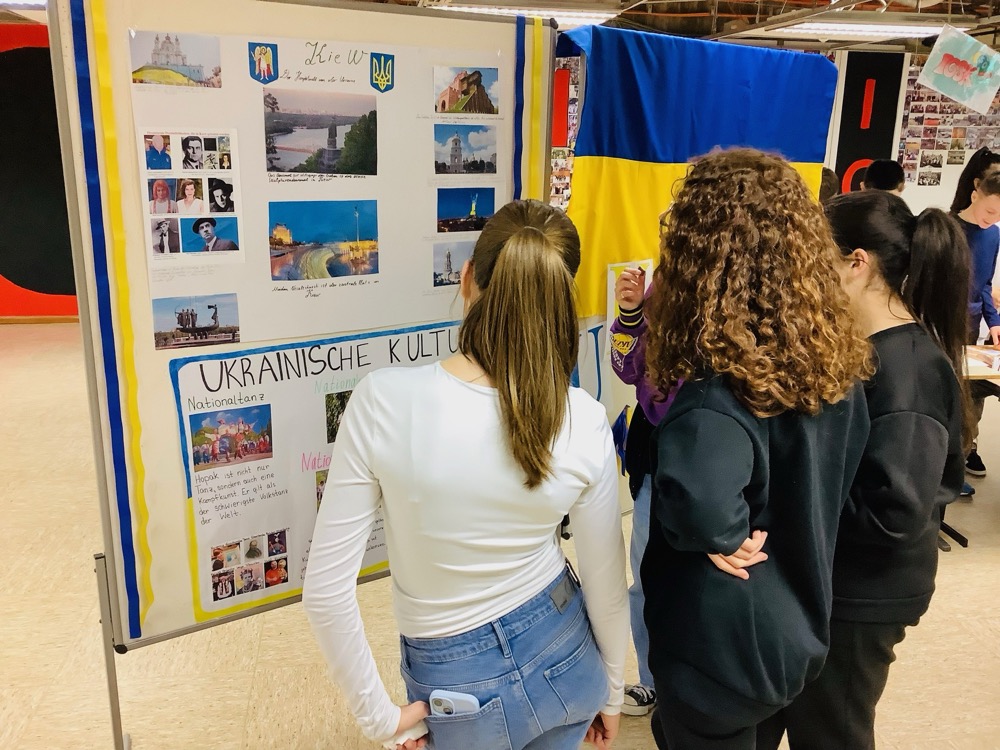 Die Veranstaltung begann mit einem informativen Video über die Ukraine, das die Sehenswürdigkeiten, die kulturellen Aspekte und die politische Landschaft des Landes beleuchtete. Anschließend versammelten sich die Schüler in der Pausenhalle, wo auf Stellwänden berühmte Persönlichkeiten, sehenswerte Regionen und verschiedene Facetten der ukrainischen Kultur präsentiert wurden. Zusätzlich wurden landestypische Spezialitäten wie "Syrnyky" (Quarkpfannkuchen) oder "Deruny" (Reibekuchen) angeboten, die von allen als äußerst köstlich empfunden wurden. Die Atmosphäre wurde durch zahlreiche ukrainische Flaggen und die mitreißende ukrainische Musik lebendig gestaltet, was die Pausenhalle zu einem Ort des lebhaften kulturellen Austauschs machte.