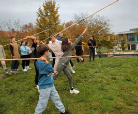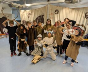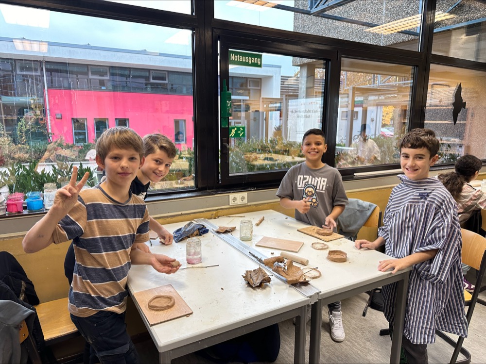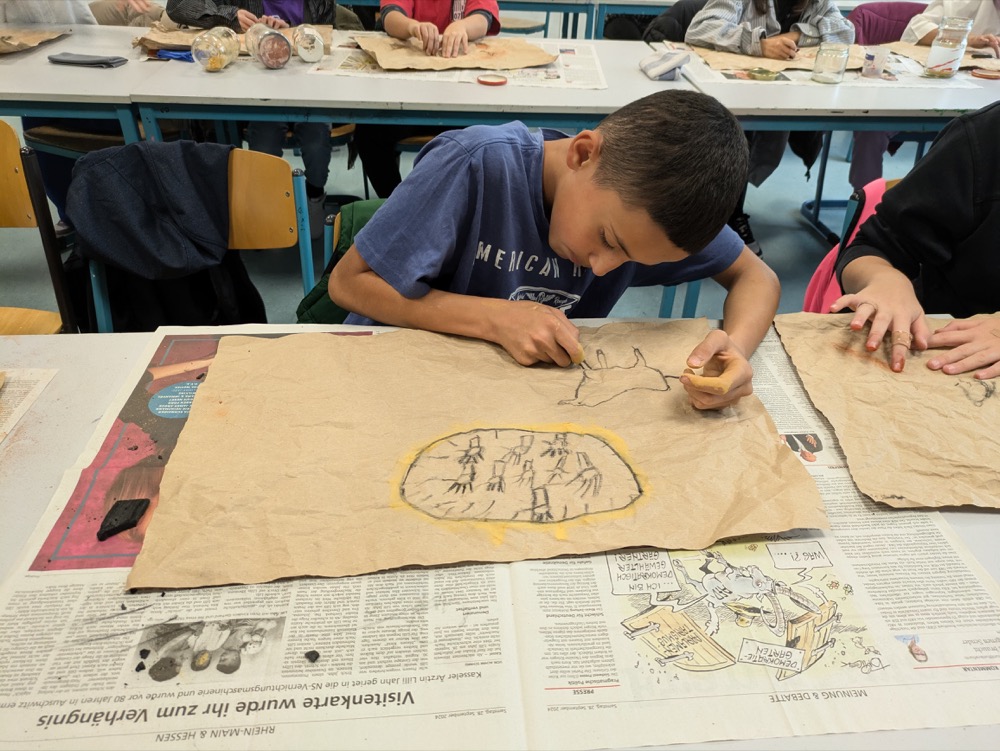 Am Montag waren wir auf einem Ausflug ins Senckenberg Museum in Frankfurt. Dort sind wir erst einmal rumgelaufen und haben uns alles angeguckt. Dann hatten wir eine Führung, ein Mann hat uns eine Steinzeit-Kiste gezeigt, wo viele alte Sachen drin waren wie z.B. eine Speerschleuder, ein altes Nähset aus Knochen und eine Schnur aus einer Sehne. Am Dienstag haben wir Höhlenmalerei ausprobiert. Wir sind in den Kunstraum gegangen und haben direkt angefangen. Erst haben wir uns ein braunes Plakat genommen und haben es zerknittert damit es so aussieht, als wenn es eine Höhlenwand wäre. Dann haben wir mit Holzkohle, zerbröselter Kreide, klein gemachter Erde, und französischem Ockergelb das Blatt angemalt. Auf unseren Bildern waren Mammuts, Bisons und Pferde. Am Mittwoch kam ein Mann zu uns, der Holger hieß. Er hat sein ganzes Steinzeit-Museum mit in unsere Schule genommen. Er hat uns sehr viel über die Steinzeit erzählt, das finde ich richtig cool. Zum Schluss sind wir dann noch rausgegangen und haben Sperre geworfen (das war mein persönliches Highlight). Am Donnerstag haben wir mit Ton gearbeitet, da hatten wir Vasen und Gefäße aus der Jungsteinzeit als Vorlage, die wir versucht haben nachzutöpfern (aber wenn ich ehrlich bin, hat eigentlich jeder irgendwas probiert). Ich habe zum Beispiel versucht eine Pfote zu machen, weil ich selbst zwei Katzen habe. Am Freitag war unser gemeinsames Abschluss-Frühstück. Als wir fertig waren, haben wir uns weiter mit der Altsteinzeit beschäftigt, da haben wir ein Video geguckt und danach haben wir unser Steinzeit Museum aufgebaut für das Schulfest am Samstag. Es war eine tolle Woche. Wir hatten alle sehr viel Spaß.