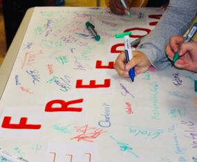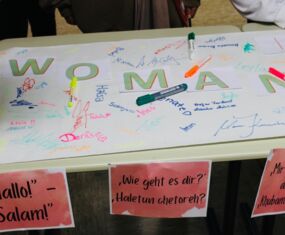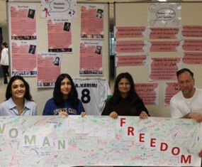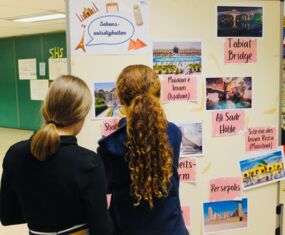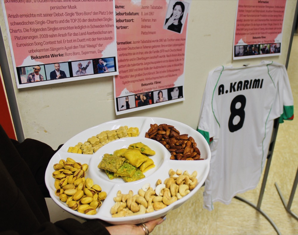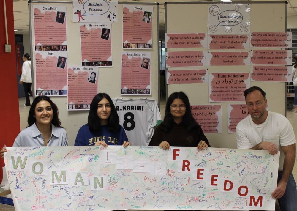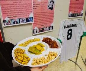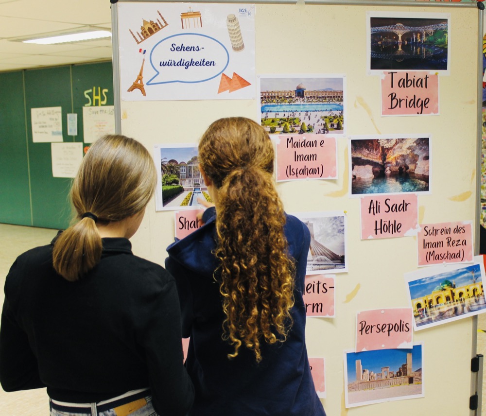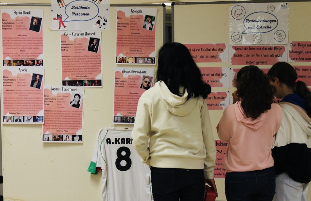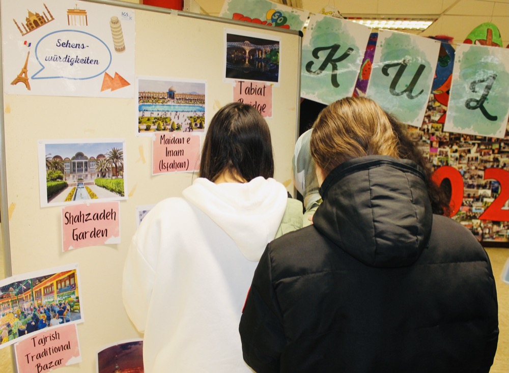 Am 24.11.2022 wurde in der IGSK die Kulturpause unter dem Titel Das Land des Safrans ,,Iran‘‘ veranstaltet. Ob Sehenswürdigkeiten, berühmte Persönlichkeiten, kulinarische Spezialitäten oder Redewendungen und Sprüche, das Vorbeikommen hat sich für die Schüler*innen und das Schulpersonal definitiv ausgezahlt. Einführend präsentierten die Schülerinnen, Ronak Rahekhoda (Kl. 10.1) und Tina Bahrami (Kl. 10.2), im Stufensaal vor großem Publikum ein eindrucksvolles Video nicht nur über die positiven Seiten der iranischen Kultur, sondern auch über politische Aspekte wie Frauenrechte im Iran, die ihr besonders wichtig sind. Ihre Botschaft brachten die Schülerinnen auf einer Wandtapete mit den Schlagworten ,,Woman, Life, Freedom‘‘ zum Ausdruck. Diese wurde in der Pausenhalle ausgelegt und Stifte zur Verfügung gestellt. Alle, die den Slogan unterstützen, konnten auf freiwilliger Basis mit ihrem Namen oder ihrer Unterschrift ihre Solidarität bekunden. Es dauerte nicht lange bis aus der weißen Wandtapete ein buntes Kunstwerk mit einer Kernbotschaft gezaubert wurde. ,,Das Besondere an der Kulturpause ist, dass die Inhalte durch Schüler*innen vorbereitet, strukturiert und präsentiert werden‘‘, so Herr Krause (Co-Leiter der AG kulturelle Vielfalt).