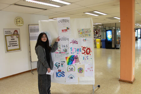 Die Planungsgruppe „50 Jahre IGS Kelsterbach“ hat sich für das Jubiläumsjahr ganz unterschiedliche Aktionen überlegt. Allem voran entstand eine Jubiläumswand in der Pausenhalle - bestehend aus kleinen, von den Schülerinnen und Schüler angemalten Steinen - unter Mithilfe der beiden Kunstlehrerinnen Hildegard Schulz und Susanne Freibert.